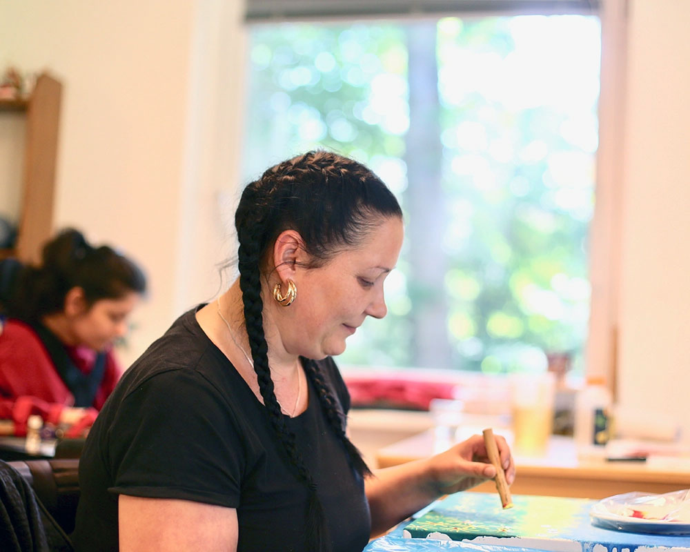 Auch kreative Angebote haben in unseren Tagesstätten einen festen Platz. In den Gruppen können Menschen werken, basteln und künstlerisch gestalten. Dabei ist Raum, eigene Ideen einzubringen, Neues auszuprobieren und mit Freude etwas zu schaffen. So entstehen zum Beispiel Holzarbeiten für Feste und Kunstwerke, die bereits ausgestellt wurden.